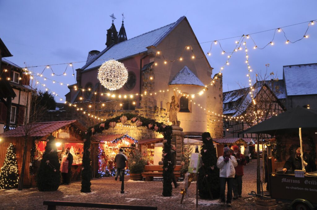 Riquewihr feels like a film set. The narrow lanes are lined with 16th-century houses draped in pine garlands, and the scent of vin chaud fills the air. Despite its beauty, it’s far quieter than Colmar or Strasbourg.